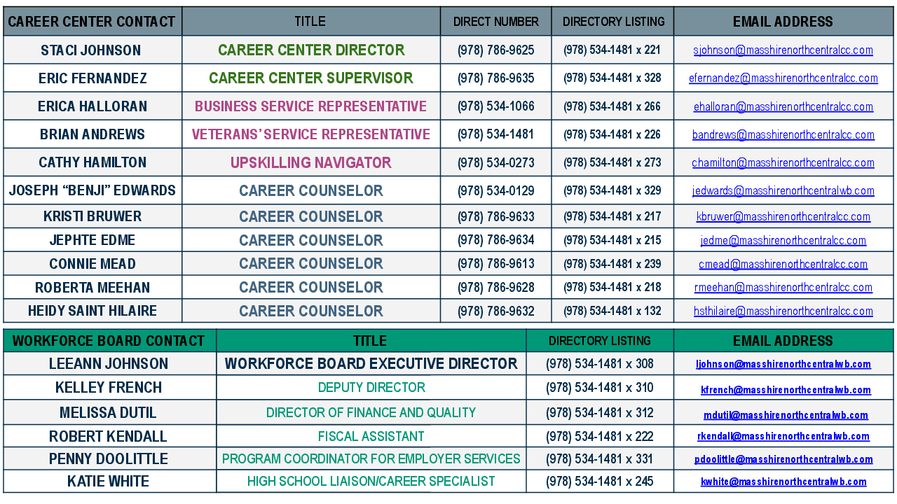 MASSHIRE NORTH CENTRAL IS YOUR ONE-STOP SHOP FOR COMPREHENSIVE NO-COST EMPLOYMENT AND TRAINING SERVICES FOR EMPLOYERS AND JOB SEEKERS. WHETHER YOU RECENTLY LOST YOUR JOB, LEFT YOUR JOB, OR ARE JUST LOOKING FOR A BETTER POSITION, MASSHIRE NORTH CENTRAL IS HERE TO HELP YOU CONDUCT AN EFFECTIVE JOB SEARCH. WE ASSIST BUSINESSES TO FIND FUNDING TO TRAIN THEIR CURRENT STAFF AND FIND THE SKILLED, MOTIVATED/ADAPTABLE WORKFORCE THAT MEET THEIR CURRENT OR EMERGING LABOR NEEDS.